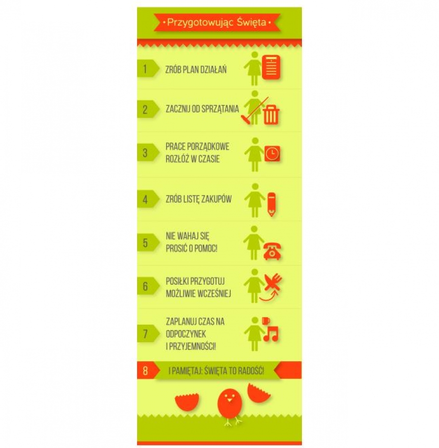 Aby uniknąć zbędnego stresu należy się odpowiednio zorganizować. Dlatego warto poświęcić chwilę na stworzenie planu przygotowań i sprawiedliwego podziału prac i obowiązków – skoro święta mają być rodzinne, to cała rodzina powinna mieć wkład w ich przygotowanie. Oczywiście obowiązki powinny być na miarę możliwości każdego z członków rodziny – młodsze dzieci świetnie bawią się przygotowując świąteczne ozdoby, starsze mogą odrobinę pomóc w kuchni.